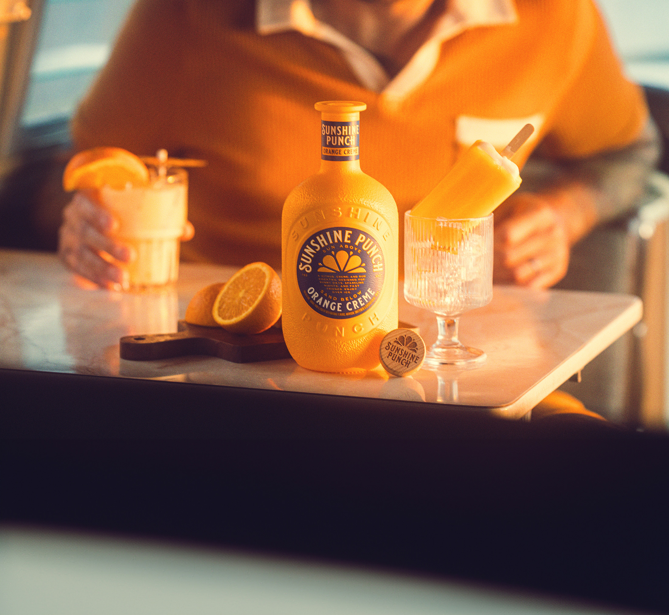 The first to launch was Sunshine Punch™ — a ready-to-serve rum cocktail with the nostalgic orange-vanilla profile of a creamsicle (without using the Unilever trademarked “creamsicle”). B-A-R had actually just received marketing photos of Sunshine Punch from another agency. While those first photos showcased the bottle well, they were clean, digital, and lacked the organic playfulness that inherently exists in the brand. We had a different vision. For this brand, we wanted to embrace nostalgia by leaning on film grain, the warmth of human interaction, and (as the name would suggest) true sunshine.